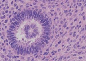 Due to suspicion of paraneoplastic autoimmune encephalitis, a pelvic ultrasound was performed, revealing a 3-cm left ovarian mass suggestive of a teratoma. Laparoscopic excision confirmed a mature cystic teratoma containing neural tissue elements (Figure 2). Postoperatively, immunotherapy with intravenous methylprednisolone (1 g/day for five days) and intravenous immunoglobulin (0.4 g/kg/day for five days) was initiated. Antipsychotics were gradually tapered as neurological recovery ensued.