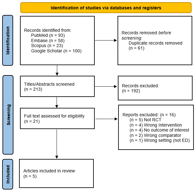 Our initial database search identified 274 records, reducing to 213 unique citations after duplicate removal. After screening the titles and abstracts, 20 studies were selected for full-text review, of which five RCTs met all inclusion criteria (Figure 1). Studies were conducted in Turkey,24 France,25 Iran,26 United Kingdom,27 and Sweden.28 All studies utilized high-frequency linear ultrasound transducers (7-12 MHz) for nerve visualization and in-plane needle insertion technique. The trials collectively enrolled 551 patients, with sample sizes ranging from 30 to 266 patients (Table 1).